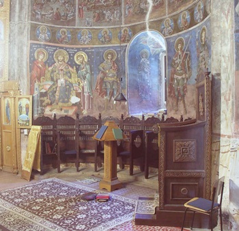 În 1852 a fost refăcută pictura prin contribuția domnitorului Barbu Știrbei și prin strădania arhimandritului mănăstirii Eufrosim Poteca. O pisanie în pridvor peste intrare afirmă: „Această reparație a zugrăvelii, după stilul original, s-a făcut cu bunăvoința Înălțimei Sale Barbu D. Știrbei, Prințul stăpânitor a toată Țara Românească, slobozind cheltuiala din Casa Centrală și prin osârdia Cuvioșiei Sale, Arhim. Eufrosin Poteca, eugumenul acestei Sfinte Mănăstiri de la Gura Motrului, la anul 1852, zugrav Niță Stoenescu.”. Refacerea picturii a însemnat în epocă o repictare a scenelor, acoperindu-le pe cele originale cu un strat protector. Aici avem un clopot al mănăstirii cu inscripția: „Dei Gratia Sacri Romani Imperii et Valachiae Transalpinae Princeps”, atestând mândria lui Constantin Brâncoveanu pentru titlul ereditar de principe al Sfântului Imperiu Roman, titlu pe care l-a primit din partea Curții de la Viena în anul 1695. „Principele” a fost un titlu nobiliar acordat în Sfântul Imperiu Roman conducătorilor unui principat. Fiind conducătorul unui teritoriu cvasi-suveran, principele avea dreptul de a purta coroană și mantie roșie. Mantia roșie a fost admisă și ca simbol heraldic al principilor. Constantin Brâncoveanu a obținut în data de 30 ianuarie 1695 titlul ereditar de principe al Sfântului Imperiu Roman. Se spune că acesta avea să fie și unul din motivele pentru care a fost decapitat, el și copiii săi, de autoritățile otomane mai târziu.
